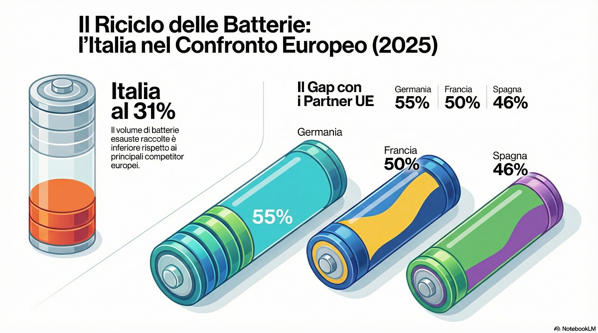 Nella raccolta delle batterie, l’Italia non brilla in Europa. Nel 2025 ha raccolto il 31% delle batterie portatili esauste immesse sul mercato, contro il 46% della Spagna, il 55% della Germania ed il 50% della Francia. Il Regolamento Ue 2023/1542 ci chiede di raggiungere il 73% entro il 2030. Un obiettivo non impossibile, ma la raccolta media pro-capite dovrebbe salire da 150 a 360 grammi. La norma europea avrà un impatto anche sul modo in cui le batterie devono essere progettate, immesse sul mercato, e si spera anche utilizzate, tracciate e infine raccolte e riciclate.