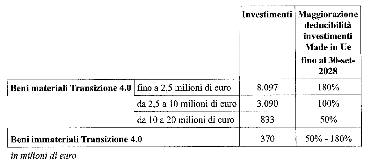 “Al fine di determinare la quota di investimenti in beni materiali 4.0 e 5.0 provenienti da Paesi esterni all’Unione Europea è stato calcolato il rapporto tra il totale delle importazioni italiane provenienti da Paesi al di fuori dell’Unione Europea in beni strumentali (categorie ‘Macchinari e apparecchi n.c.a’ e ‘Computer, apparecchi elettronici e ottici’) e il totale degli investimenti in beni materiali effettuati dalle imprese italiane nell’anno d’imposta 2023, pari al 20%. Si ritiene che tale quota possa costituire una proxy degli investimenti Extra UE ultimati nel 2026, in quanto plausibilmente già pianificati all’entrata in vigore della norma. Si assume invece che, per effetto dell’esclusione degli investimenti Extra UE dall’agevolazione, a partire dal 2027, le imprese modificheranno le loro scelte di investimento in riferimento all’area di provenienza dei beni e tale quota sarà ridotta al 10%”.