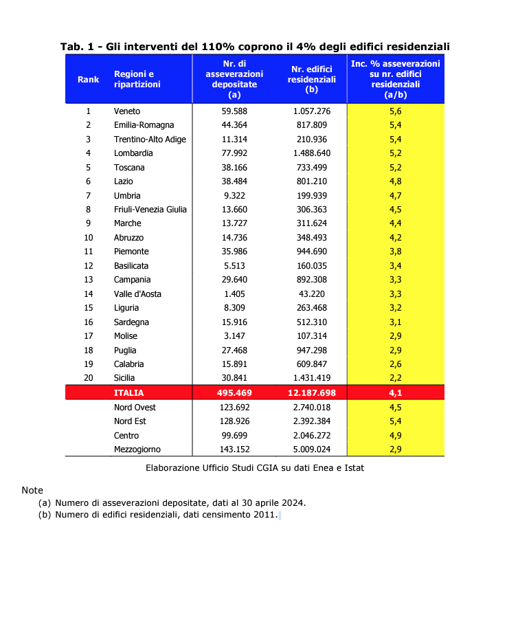 In rapporto al numero di edifici presenti sul territorio è il Veneto la regione che ha sfruttato di più il Superbonus, con un’incidenza percentuale di asseverazioni sul numero degli edifici residenziali esistenti pari al 5,6%, a fronte di 59.588 domande depositate.