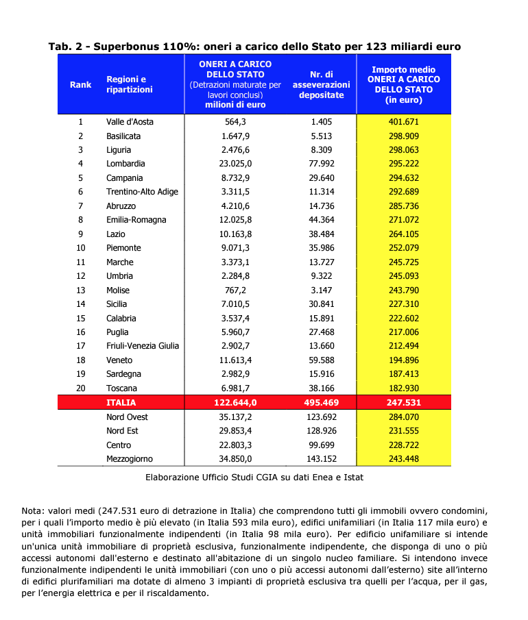 A livello nazionale, l’onere medio a carico dello Stato per il costo del Superbonus è stato di 247.531 euro per edificio.