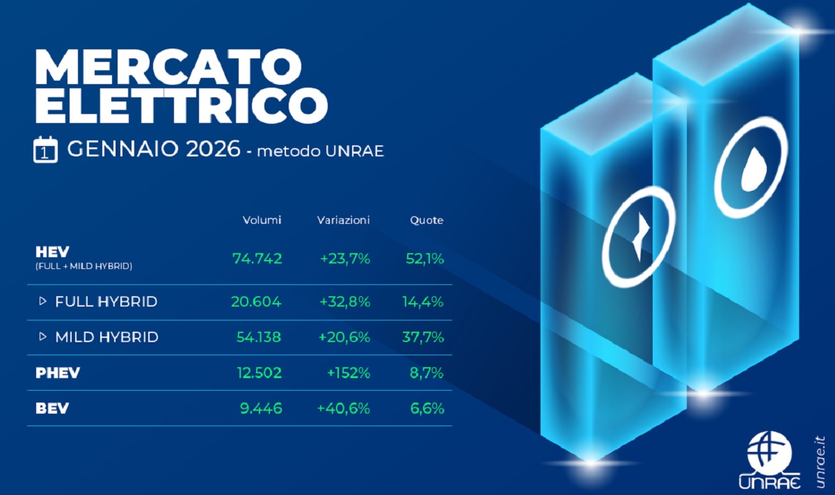 Il 2026 inizia con il piede giusto per il mercato delle auto elettriche. Sono 9.446 le immatricolazioni che raggiungono una quota di mercato del 6,6%. Rispetto al gennaio 2025 la crescita è del 40,6% quando le BEV vendute erano 6.718. Ed il segno è positivo anche per il resto del mercato, che raggiunge 141.980 immatricolazioni e +6,2%. Ma il confronto con il periodo pre-pandemia è sempre penalizzante: rispetto a gennaio 2019 mancano ancora circa 23.300 unità, circa il 14,1% in meno.