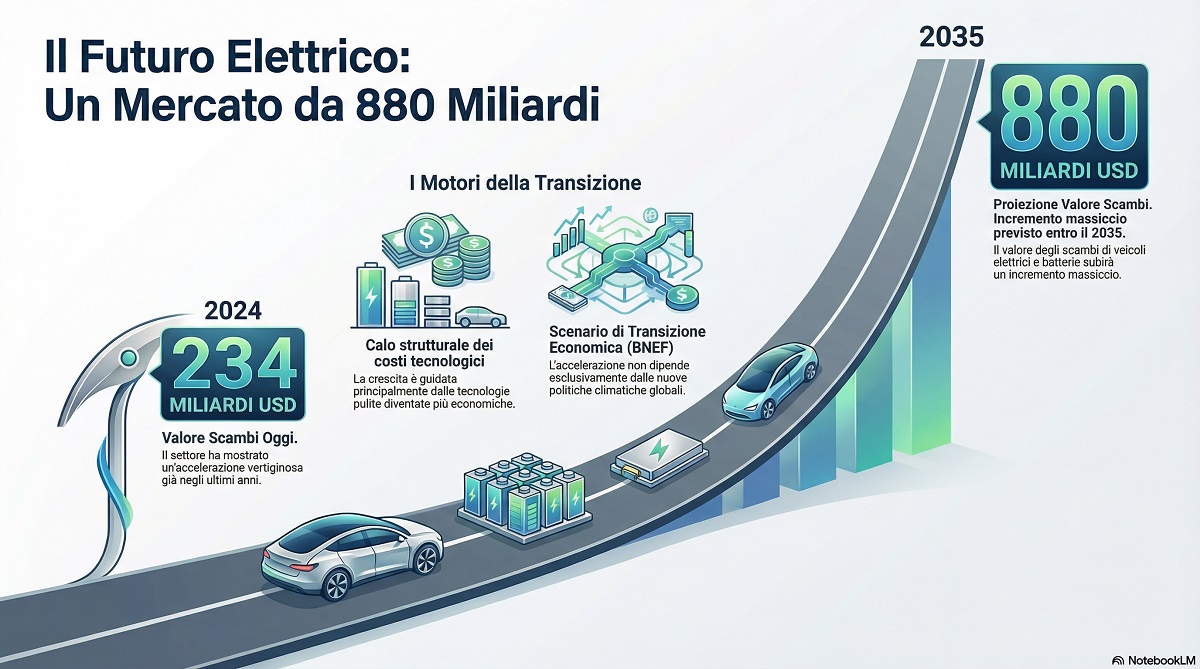 Secondo lo Scenario di Transizione Economica di BloombergNEF, nel 2035 il valore degli scambi di BEV e batterie salirà a 880 miliardi di dollari, quando nel 2024 era di 234 miliardi
