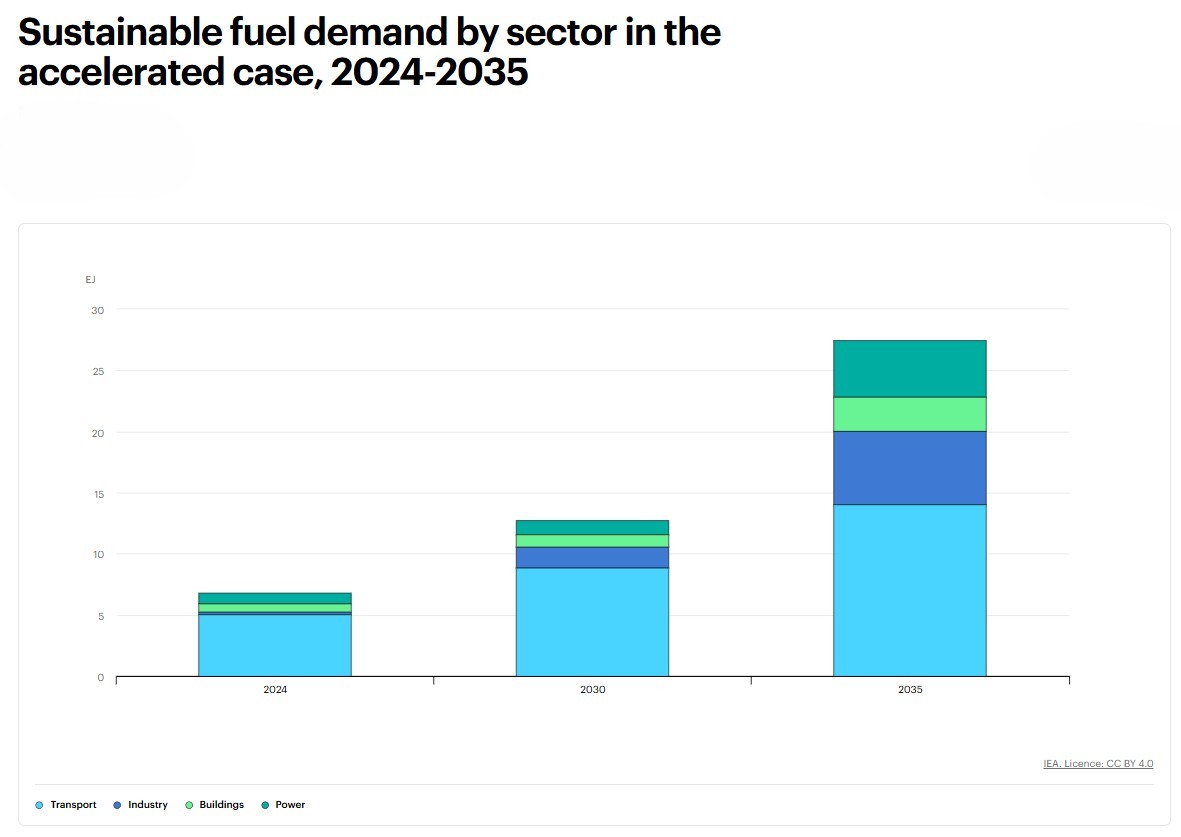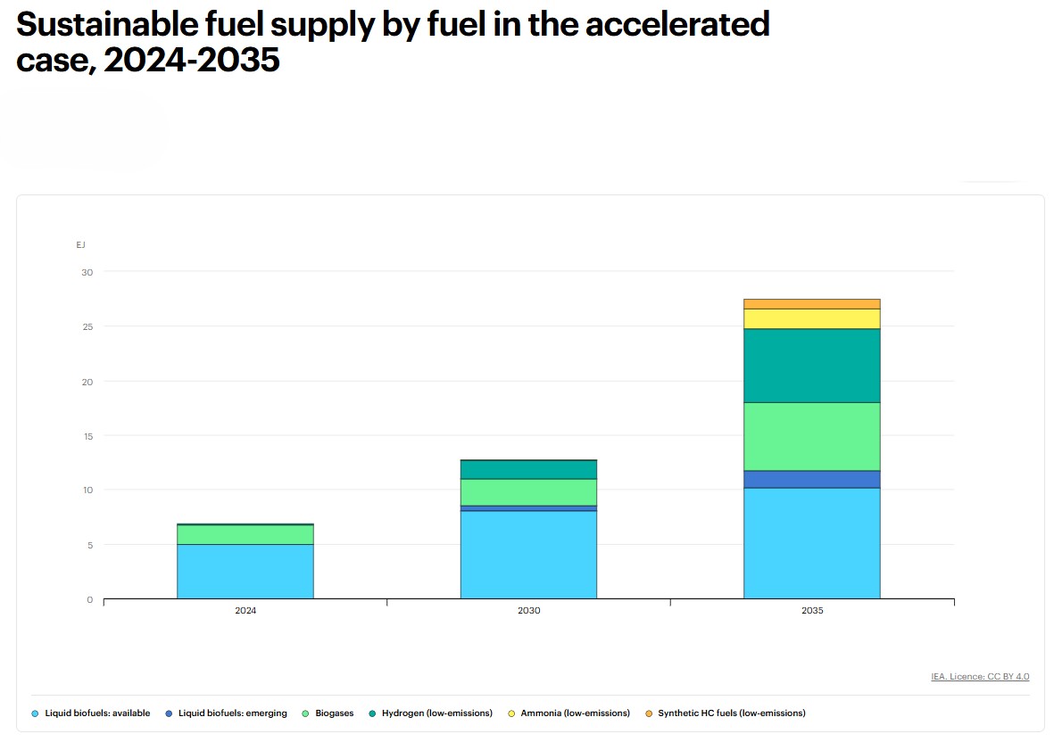 Secondo il documento, l’uso di combustibili liquidi e gassosi a basse emissioni potrebbe quasi raddoppiare entro il 2030 rispetto ai livelli del 2024 e quadruplicare entro il 2035, a condizione che le politiche attuali e quelle in fase di approvazione vengano pienamente attuate. La domanda complessiva di combustibili liquidi e gassosi sostenibili potrebbe passare da circa 6 exajoule nel 2024 a oltre 25 exajoule entro il 2035, un incremento di oltre quattro volte in poco più di un decennio.