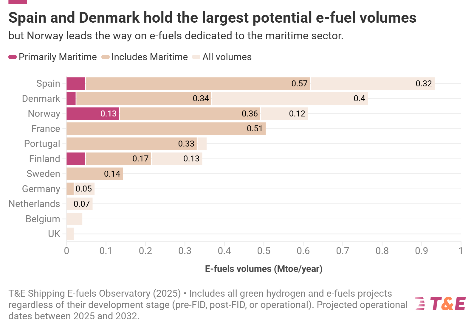 La Norvegia è il principale potenziale fornitore europeo di carburanti sintetici per il settore navale, seguita da Spagna, Finlandia e Danimarca