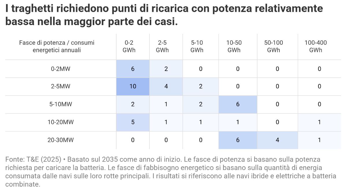 La flotta italiana conta 167 traghetti, tra le più grandi in Europa. Secondo T&E, già oggi il 51% dei traghetti italiani è tecnicamente sostituibile con imbarcazioni full electric a batteria. Un ulteriore 26% potrebbe operare in modalità ibrida.