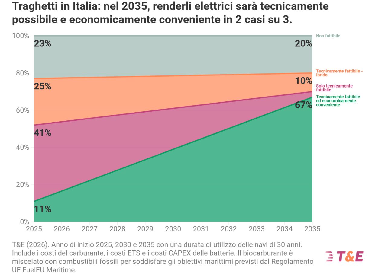 T&E ha sottolineato che il peso del traffico interno italiano rende la elettrificazione dei traghetti particolarmente strategica. Le rotte fisse e prevedibili facilitano la transizione.